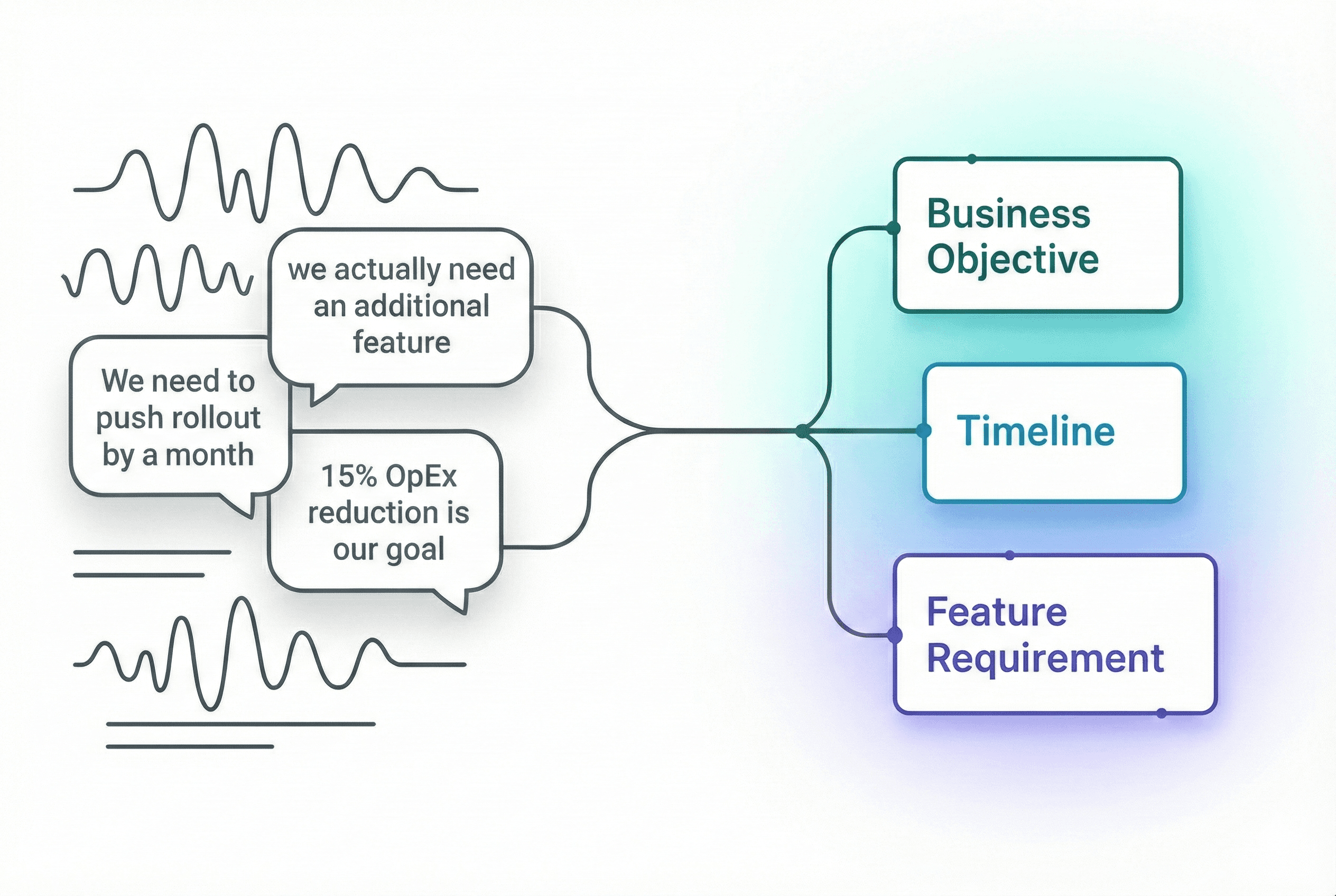 Shifts in business objectives, timelines, and requirements hide in your recordings. DistillCloud extracts and connects those signals automatically, so you can spot drift before it derails your work.
